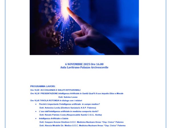 Asssociazione Cattolica Operatori Sanitari Palermo WORKSHOP L’INTELLIGENZA ARTIFICIALE IN SANITA’ RISCHI E OPPORTUNITA’ PER LA PERSONA 6 NOVEMIIRE 2025 Ore 16.00 Aula Lavitrano, Palazzo Arcivescovile